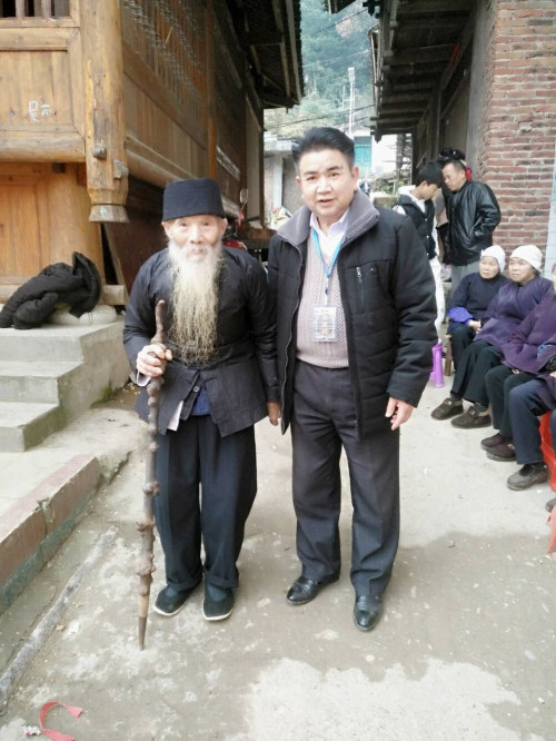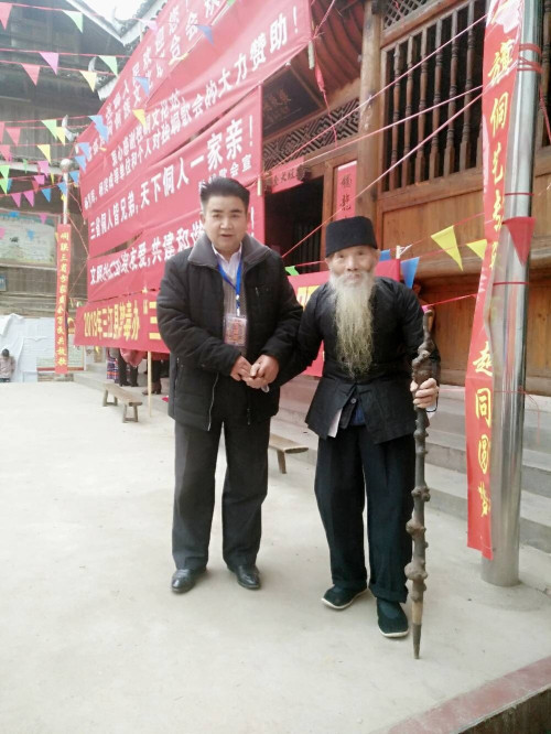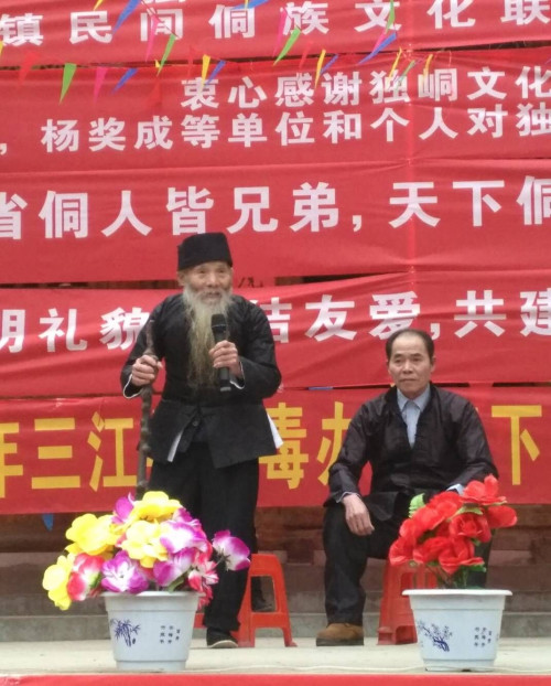 今年冬,在三江侗族自治县独峒镇举办的第二届桂、湘、黔三省民间侗歌汇演上,有幸认识了一位吴家的寨老,他叫吴申仁,今年86岁,是独峒镇独峒村人。他人品好,有威望,为人正直。他储有长须,人很精神。他在舞台上带着一帮7、80岁的老人表演“讲款”,声音洪亮,铿锵有力,完美地展现了当时侗族众人在鼓楼坪上,顷听寨老“讲款”的生动场面。