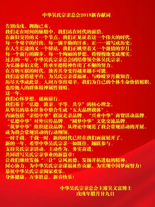 一时千载,千载一时,新的时代已经在我们面前展开了。新的一年,希望中华吴氏宗亲一如既往,踊跃参与、支持吴氏宗亲活动,主动作为,务实奋进,共同谱写吴氏宗亲事业的新篇章!让我们继续发扬“三让”宗风祖德,发扬开拓进取的精神,同心协力,为中华吴氏宗亲谋福祉作贡献,为实现中国梦而努力!