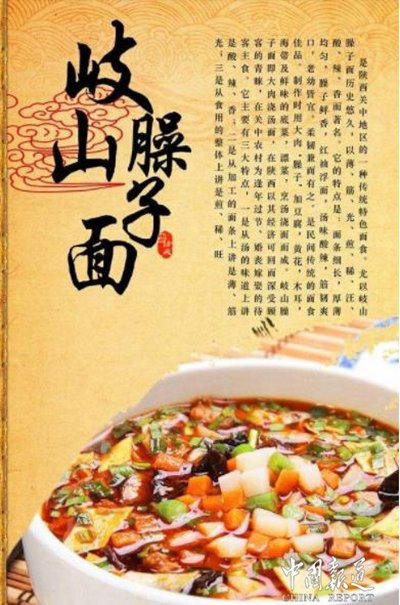 这种独树一帜的吃法,起源于3000多年前的先周时期,植根于历史的深处,承载着巨大的教化功能。从古到今,围绕着岐山臊子面这一美食现象,流传着许多美好的传说和故事。传说周文王在渭水之滨射杀了一条大蛟龙,仁慈的周文王要与民同乐。为了让更多的人吃到这种美味,他让属下把蛟龙熬成一大锅肉汤,用此汤浇面,只吃面不喝汤,剩汤要倒入锅中继续加热,循环使用,以便更广泛地与大家分享。结果众人皆大欢喜,更加拥戴文王。据此,臊子面又有一个别名叫“蛟汤面”。这种说法最为流行,也和文王一贯推行的仁政德治是相吻合的。另一种颇具文化韵味的名称叫“孝子面”:说是老人们特别爱吃臊子面,那些孝顺老人的儿女便尽量满足老人的心愿,每逢重要节日以及待客时,便精心做好臊子面以孝敬老人。甚至一些早已和父母亲分家另立门户的青壮年,在吃臊子面时也要把年迈的父母请来犒劳一顿。所以每一次臊子面宴,都是一次温暖的老人节,它把在现实生活中往往被人掰成两半的“孝”字,一次次地缝合起来,使得以忠孝为核心的中国传统文化得以不断延续,同时也一次次地构建着和谐的生活画面,呈现出升平与欢乐的景象。有一种教化存在于饮食习惯之中,岐山臊子面的吃法便属于这种情况。其中对周礼文化的传承,让人刻骨铭心。(该文曽发表于《宝鸡日报》)