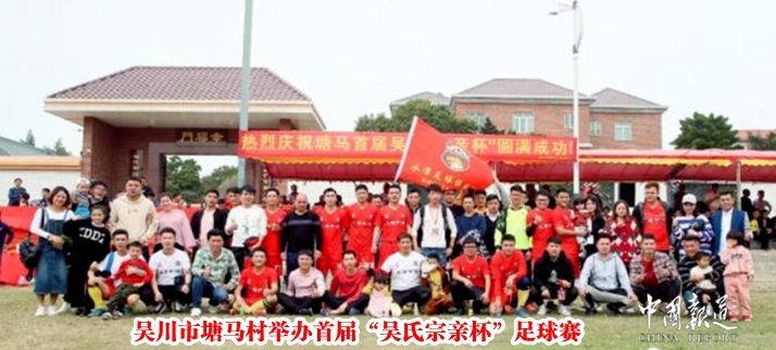 中国报道讯(吴蜀丰吴川报道 特约通讯员 吴超明)2019年广东省湛江吴川市塘尾街道塘马村举办首届“吴氏宗亲杯”足球邀请赛,来自塘尾街道辖区内的塘尾塘马村、吴阳上郭村、黄坡水潭村、长岐肖山村、黄坡那葛七斗村、黄坡稳村、兰石百官山村、吴阳东边勇村、吴阳里屋沙新村、吴阳新勇村、吴阳里屋沙大村、吴阳亚拉伯队、吴阳秧义村、振文里坡村、塘缀步龙村、长岐葵根村共16村吴民宗亲参加比赛。