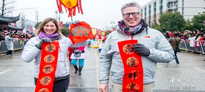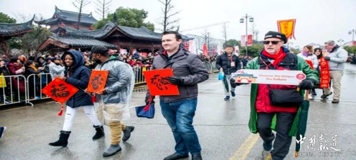 在鼓乐声声中龙凤呈祥、高跷抬阁、渔翁戏蚌、江南莲湘,一道道“民俗大餐”惊艳亮相,早早地就等在道路两旁的男女老少纷纷举起手机记录这热闹,传统文化VS国际友人,在浓浓的传统文化氛围之中,6位国际友人组成的老外粉丝团格外抢眼也当之无愧地成了众人争相拍照的“吉祥物”,他们手持“福”字和对联不停地向人群挥手致以中国农历新年的问候,大伙儿也都热情地回应着:“Hi~”“HELLO!”Amy & Roger (美国):我们正在中国旅行,1个月前来到无锡。能在这里度过中国新年,参加这样盛大的庙会太兴奋了!它将会成为我们中国之旅中的独特记忆!黑人小哥:这不是我第一次参加中国的庙会,但是梅村这里的特别隆重、活动特别多!我很高兴参加了舞龙舞狮的舞蹈,还了解到很多有关泰伯和中国传统的东西,非常棒!一行人看得正入迷Roger突然跪在地上。