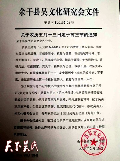这次会议决定了每年的农历五月十三日(吴芮王出生日)定为芮王节,为吴氏后裔世世代代更好地缅怀祭祀吴芮王。下午,吴文化研究会还召开了全县吴氏总谱第二稿的讨论,同时成立了余干县吴文化研究会筹措资金领导小组,分县内县外去开展筹资工作。