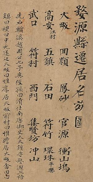 有明显残缺,现仅存“世系图”、“婺源县迁居名族图”、“祁门县迁居名族图”三部分。“世系图”自“一世”而至“十七世”,以下残缺;“婺源分支”部分基本完整,仅标题下半段略损;“祁门分支”部分残后半段,迁居记录至宋建炎时期为止。