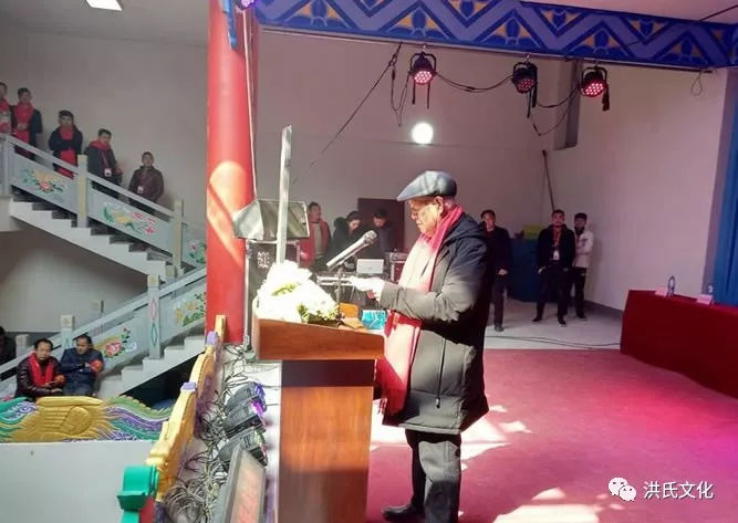 关于洪姓源流有十一种之多,世易时移,很多历史无法一一考证。据《洪氏宗谱》介绍,洪氏始祖系共工氏,是炎帝后裔,后人奉为水神。约至东汉,后裔避仇迁居敦煌,改为洪姓。洪氏一始祖名“普”,生于143年2月1日。洪氏宗谱创修谱序称“洪氏之先系出姬姓卫大夫弘演之后,唐时避高宗子讳,始易洪以为姓。”图为洪家源洪氏族长在落成典礼上致辞。