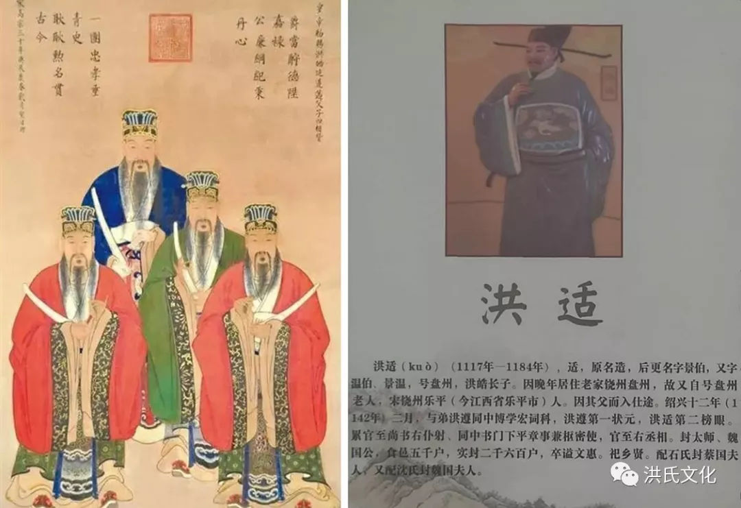 全国各地洪氏宗祠一般悬挂“敦煌世家”的匾额,《郡望百家姓》云:洪氏望出敦煌郡(今甘肃省河西走廊西端)。《姓氏考略》云:望出宣城、豫章郡(今南昌、九江一带),有联曰:鄱阳三瑞成连理,豫章四英振家声。三瑞,出自洪皓,南宋鄱阳人,政和进士,建炎年间受命出使金国被扣十五年始终不屈,初官宁海主簿时,功德卓著致县中荷花、桃、竹皆成连理;而四英出自洪师民,北宋南昌人,其四子明、刍、炎、羽皆以才华著称,人称“四英”。