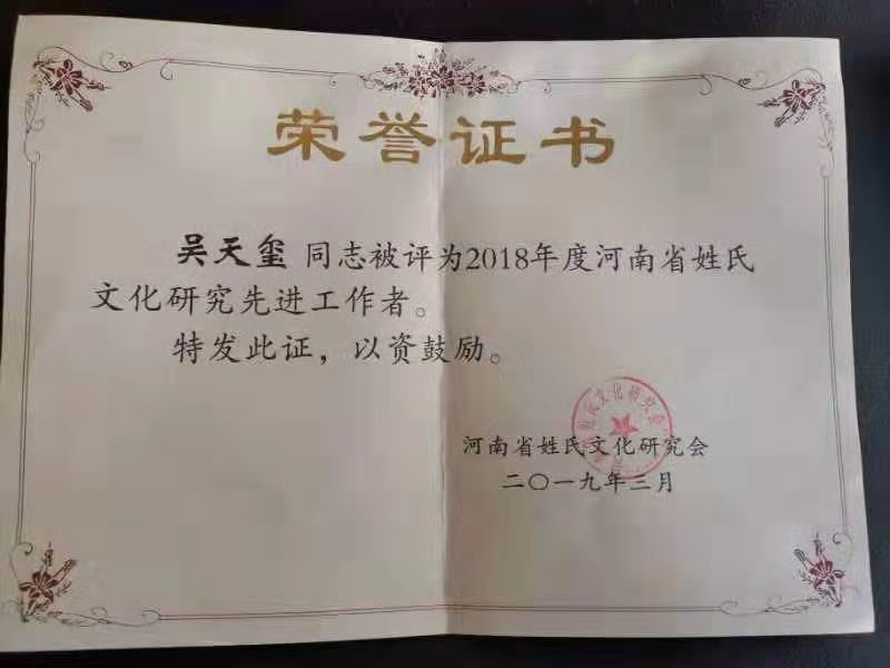 对于这次获得2018年度河南省姓氏文化研究先进工作者荣誉称号,吴天玺宗姐说,这是荣誉,也是动力,今后将更加努力于推进与发展吴氏宗亲的文化事业。