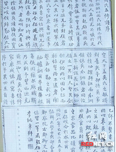 湖南益阳桃江县桃花江镇牛谭河社区吴辉然宗长,有《吴氏六修族谱》,其中有清末直隶总督、淮军创始人李鸿章,清末军机大臣、湘军将领左宗棠,清末两江总督、兵部尚书、水师统帅、湘军首领彭玉麟,清末礼部尚书、两江总督、曾国藩之弟曾国荃,曾任广西巡抚沈秉成,曾任湖南巡抚卞宝弟等众多清末重臣为这本族谱所作的序文各一件。