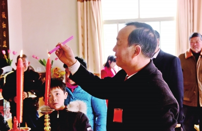 ▲今年接谱主办的户主周继兵,在宗亲的簇拥下拿出两支红烛、一柱香相继点燃。