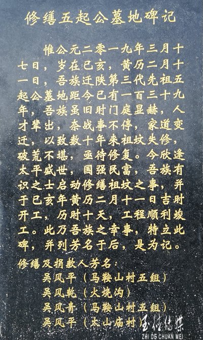 据史料记载,吴五起系清授登仕郎,在世时因武功高超,精通周易和医术,擅长玄学,被尊称为神人。吴五超系清授修职郎,文韬武略,倍受世人敬仰。因世道变迁,坟地年久失修,四周荆刺遍地,人不得近。通过此次修缮,坟地焕然一新,具有承前启后、教育启示后人敬祖孝亲的带头作用。