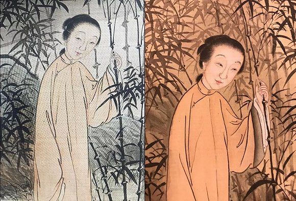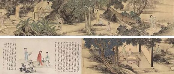 画卷落款钤印完全相同,本幅人物神情动作,景物位置笔法几乎毫无二致,依次描绘孙云凤、孙云鹤、徐裕馨、席佩兰、汪缵祖、严蕊珠、捧砚侍女、汪妽、廖云锦、张玉珍、屈婉仙、蒋心宝、金逸、鲍之蕙、袁枚、戴兰英、恩官。仕女是典型的清人开相,中规中矩,比较明显的不同处有:孙云凤上博卷为绿衣,佳士得卷为紫衣;孙云鹤上博卷为紫衣一手拢袖,佳士得卷为绿衣一手垂袖;抚琴的席佩兰上博卷头上没有发髻,佳士得卷有一个小小的发髻;汪缵祖上博卷淡紫色衣衫,佳士得卷浅绿色衣衫;廖云锦手指稍异,上博卷为淡紫色衣衫,佳士得卷绿色衣衫;屈婉仙上博卷着白裙,佳士得卷着黄裙;蒋心宝差异最为明显,上博卷目视卷首,佳士得卷则目视卷末,此外树石亭台也有些差异。但这些差异都不害笔墨,不导致风格上的分别,远远不足以以此判断真伪优劣。