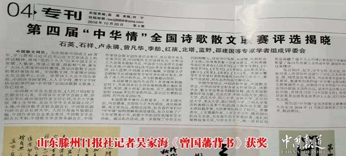 中国报道讯(吴蜀丰)滕州日报社后勤人员吴家海,在干好本职工作的同时,也写点小说。所写小说《奇女刘月娥》,于今年2月15日,参赛“李煜”杯全国文学大赛,2019年3月26日主办方公布获奖名单。在7992篇参赛文章中脱颖而出,在初评及读者评比中位列第一,在终评中位列第五,在1403部小说中列第一,荣获佳作奖。