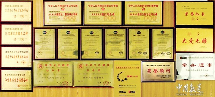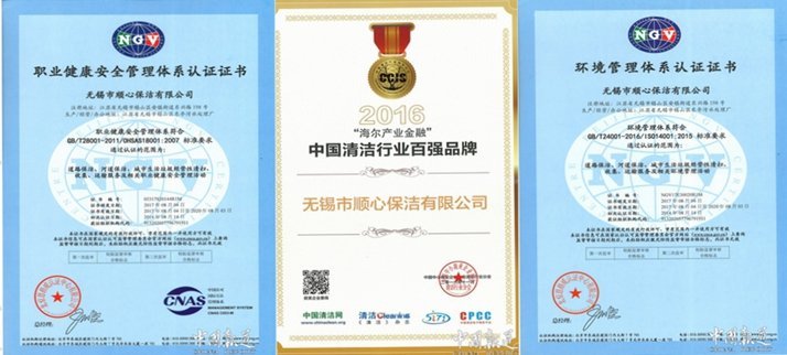 “以心血炼精品,以人品铸品牌”!13年来,顺心保洁先后通过了“道路运输经营许可证”、“从事城市生活垃圾经营性清扫、收集、运输服务许可证”、“ISO9001质量管理体系认证”、“ISO14001环境管理体系认证”、“ISO18001职业健康安全管理体系认证”、“安全生产标准化三级”、中清协“国家一级证书”、并荣获天长市争创全国文明城市“突出贡献单位”、“重合同守信用AAAAA企业、信用等级认证AAAAA企业、质量服务诚信AAAAA企业”、“无锡市重合同守信用企业AAA级”、江苏省广播电视总台“江苏省优质服务品牌”、“最具责任感优质服务单位”、“江苏省优秀诚信服务单位”、江苏企业网“江苏最具实力诚信企业”、等各项荣誉证书,以卓越的业绩和信誉创建了顺心品牌。