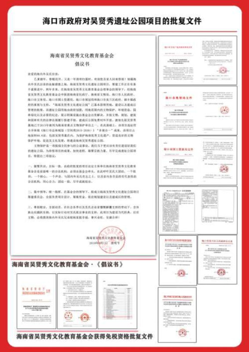 一、凝聚共识,目标一致。由政府批复的项目法定主体单位海南省吴贤秀文化教育基金会是省级唯一的合法机构,必须由基金会牵头,在此呼吁吴氏大团结,一个组织,一个核心,一个声音,与国内外吴氏有志之士,以及省内各市县的有代表性的合法机构,同心合力,团结一致,尽早成就祖业。
