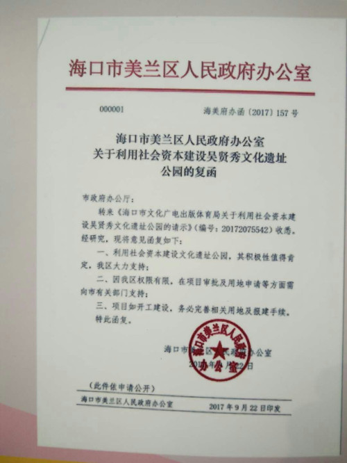 二、集中领导,统一指挥。在基金会的领导下,拟成立海南吴贤秀文化遗址公园项目。筹建委员会,全面负责项目设计、筹集资金、依法规划建设以及建成后的管理。
