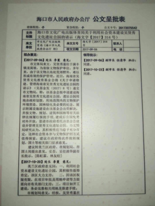 乙亥猪年,春暖花开。又是一年清明扫墓时,欢迎您及家人回来祭祖!琼藉海内外吴氏宗亲的血脉感恩之地,海南吴贤秀文化遗址公园项目,筹建工作正在有条不紊推进中。两年多来,在海南省吴贤秀文化教育基金会理事会的领导下,经海南省吴贤秀文化教育基金会申报获海南省民政厅、海南省文物局、海口市人民政府、海口市文体局、海口市国土资源局、海口市规划局和海口市美兰区政府、演丰镇政府的重视与支持,“海南吴贤秀文化遗址公园”已基本获得用地,建设以及建成后管理的批准,该遗址公园用地由政府划拨,用地范围内的文物保护,环境营造,园林绿化以及必要的纪念,展示附属设施由基金会出资解决,并按文物,规划,建筑和园林有关的法律法规履行报建手续,建成后公园免费对外开放。渡琼先祖吴贤秀墓地已于2015年被列为海南省重点文物保护单位之一,在此基础上,该项目选址符合并体现《海口市总体规划(空间类2015-2030)》“多规合一”成果,该项目占地面积66.6亩,包括吴贤秀墓在内,为保护海南优秀文化遗产,营造良好的文物保护环境,促进吴文化发展,将建设海南吴贤秀遗址公园。