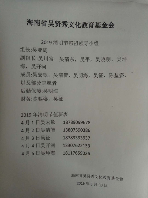 阳春四月,春暖花开。又是一年清明时,为缅怀先祖,纪念渡琼先祖吴贤秀公,激励后代勤奋进取,继承吾祖之美德家风,为此,我们海南省吴贤秀文化教育基金会于4月1日上午八点在海口市美兰区演丰镇龙窝坡吴贤秀公墓祭祖。当天上午,德高望重的吴亚荣名誉理事长,原省政协吴可义宗长,基金会的理事会领导吴川富,吴清东,吴平,吴晓明,吴坤海,秘书长吴开河,社会各界宗亲吴文波,吴馨,吴仁武,吴纯,吴金泽,吴清智,吴宏钦,吴超,吴忠强,吴名居,吴乾虎,吴青锦,吴海彪,吴多柏,吴钟尧,吴坤宏等三十多人,共同祭祖,感恩吾祖。