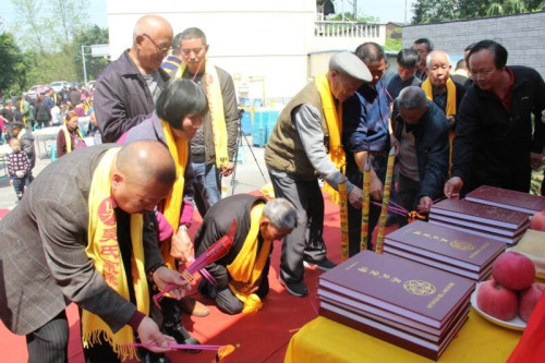 请族委会主任吴秀福、族长吴荣文、副族长吴维前发谱;(按照字辈选一个代表上台领谱,领谱人向祖宗牌位灵前三跪后在从主任手里接过新谱,之后后退,从侧面庄重地离开)。