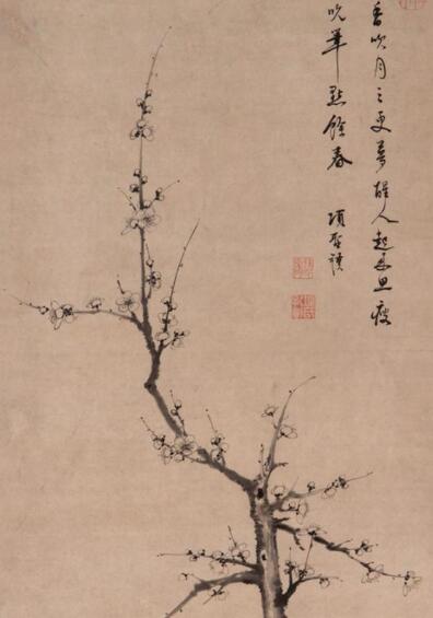 纸本墨色,纵103、横41厘米,此幅墨梅构图简洁,没骨法绘制,整体呈现出清香远逸的画面。折枝梅花挺劲有力,画中梅花,或含苞待放,或略吐花蕊,尽显清雅高洁,神清骨秀,令人发幽独超逸之思,画家把梅花的风神骨气也表现得淋漓尽致。画右上自题五言诗:“一笛香吹月,三更梦醒人。起来思瘦影,吮笔点余春。”如此绘制再加题跋可窥探出作者作画的心境,在夜深人静之时,三更梦醒,以梅咏春,用笔来留下他对春的向往。落款“项圣谟”,钤“往吟客”朱文印,“项氏孔彰”白文印,引首有“无可无不可”朱文印