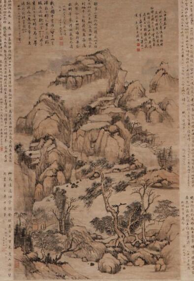 绢本设色,纵201.5、横48厘米。此幅构图饱满,主次分明,笔致苍劲,气韵深厚。画面富有层次,上面为层峦叠嶂,气势恢宏;下面是林木茂盛的山谷,山谷中有凉亭一座,茅屋两三间,小桥和溪流,桥上的人与屋中的人在交谈,有诗有画有故事。右上角有题跋:面山临水结茅居,兀坐焚香日著书。有客到间无别事,闲凭栏楯数游鱼。秀水王概画并题。钤白文方印“王概之印”,朱文方印“安节氏”。左下角有朱文押角章“徽绩汪氏惕子鉴赏书画之章”。王概是浙江秀水(今嘉兴)人,多才多艺,交游广泛,率先编绘中国画技法图谱,乃中国绘画史上著名著作《芥子园画传》的编绘者。