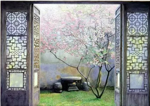春晨宜独坐。柳烟匀到桃树,洇湿玲珑曉露,闲看花如火。东风偏吹破。吹过百年古井,卷起飘零清影,难解生涯锁。