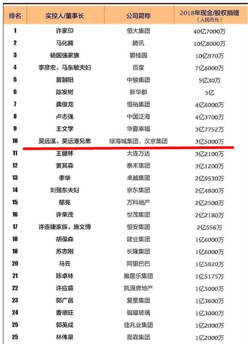 这一善举,使得汉京集团董事长吴远港先生、绿海城集团董事长吴远溪先生跻身2018慈善捐赠最多的十大中国企业家行列。