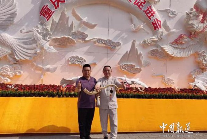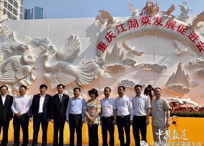 中国报道讯(吴蜀丰)原标题(--神奇的重庆第三张美食名片--“重庆江湖菜·旱蒸牛肉”当日签下三大单)“30个人、上千小时,333平方米,双重喜庆、匠心独运…”4月27日,2019中国(重庆)国际美食节暨第十三届中国餐饮产业大会活动现场获悉,由重庆江湖菜发展促进会创意制作的一幅名为“百鸟朝凤”匠心美食艺术融合的巨型雕刻作品惊艳亮相,其不仅是首次实景公开展示,还在业内创下多项之最、将申报吉尼斯世界纪录,吸引来自各地的中外游客留影,成为“打卡新网红”。