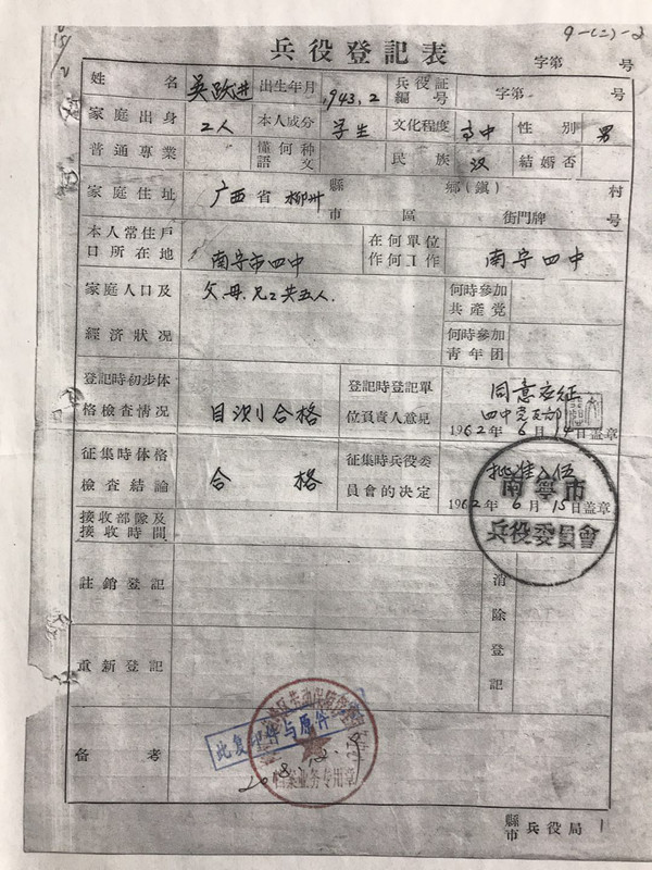 正常的征兵时间是春节前后,而我们是6月份入伍,是非常时期的入伍时间,说明中印边界和海防前线有些吃紧。而且都是征召在校学习的高中生和大学一、二年级的学生,当时国家经济是最困难的时期,在农村征集的青年因营养不良,身体检查多数不合格,所以转而征集城镇和大中城市的青年学生紧急入伍,补充前线兵源。我义不容辞地报名参军,投笔从戎走进军营,履行国家有难匹夫有责的义务。
