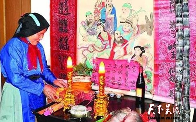 全部准备妥当后到了傍晚正式开始过节。正面墙上挂着神轴,长桌上放着水果之类的祭品,八仙桌上一道道的菜肴,桌子两边放着酒盅和筷子,酒盅里斟满了酒。沿八仙桌两边是椅子。八仙桌正面是香烛,地上是一只锡箔缸。缸前是红毡蒲团。等一切准备好,开始上香、点烛、烧锡箔,然后由长辈带头向祖先磕头,我们就按着辈份和年序轮着向祖先磕头。我们磕头后之后就围着看那两支红红的蜡烛,看它如果结花,如何跳动。据说蜡烛的火焰在跳动时是祖先在享用祭品和酒菜。家里的大人们依然忙忙碌碌,在烧菜肴,端上供桌,家里热热闹闹,一直到蜡烛熄灭,祭祖的事才告结束。