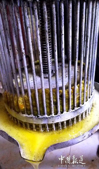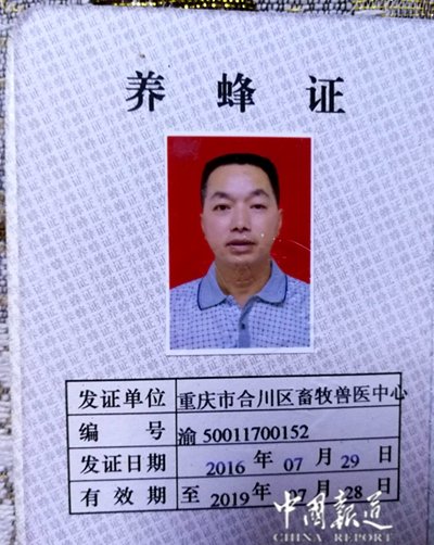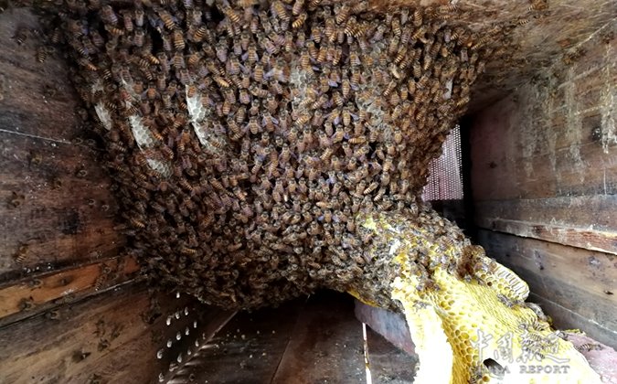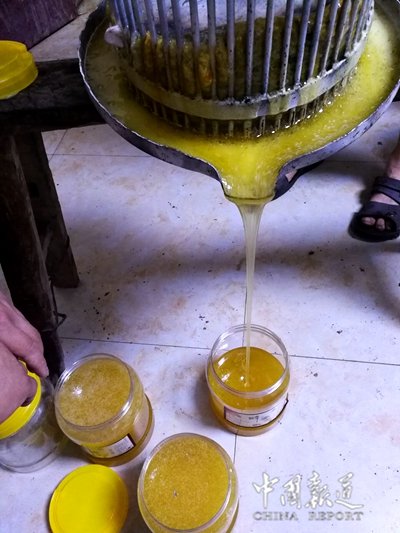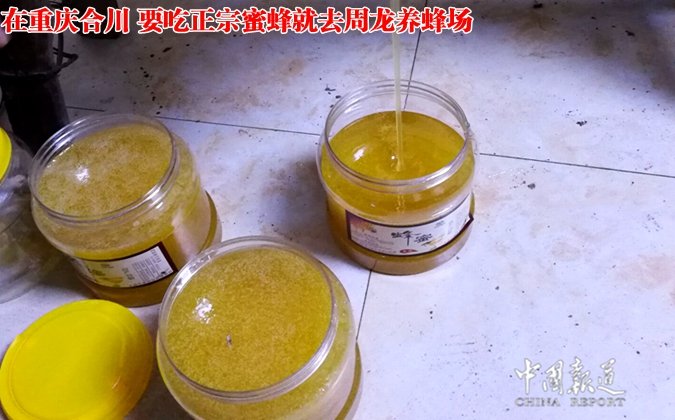 中国报道讯(吴蜀丰)若果你想买到正宗的蜂蜜,你可以开车去重庆合川区铜溪镇袁桥村1社周龙养蜂场,在这里,你将亲自见证养蜂专家周龙从蜂箱里取下来,当场手工将蜂蜜压榨岀来然后用罐接下蜜蜂液。