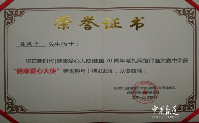 中国报道讯(吴剑波报道)日前,由国家相关部门举行的“新时代《健康爱心大使》建国70周年献礼网络评选大赛”活动中,北京至德圣道中医药研究院长以绝对优势被评选为“健康爱心大使”称号,并获得奖品。