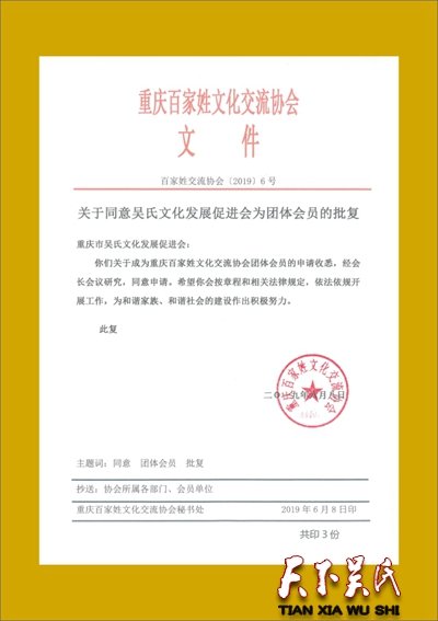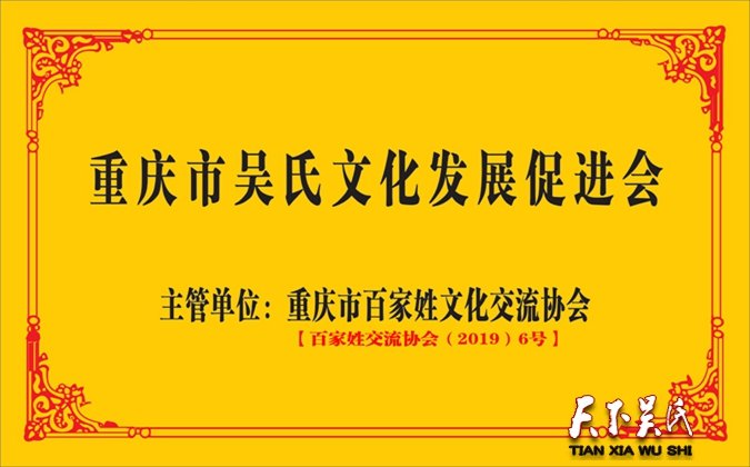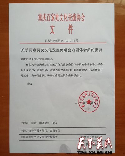 据介绍,全国各地省市均成立有吴氏宗亲会组织,唯独长江上游地区直辖市重庆成为空白,据介绍,重庆吴氏文化发展促进会是经重庆市百家姓氏文化交流会批准(2019)6号。据了解,目前重庆市百家姓氏文化交流会审批极为严格,每年仅有几个姓氏名额获审批。