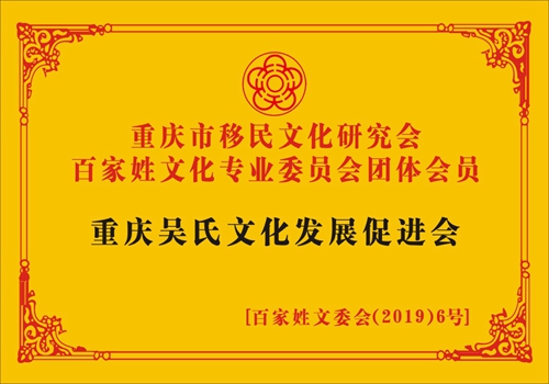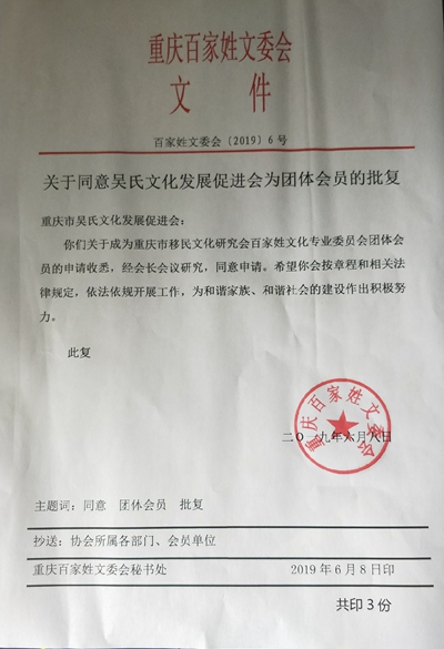 据介绍全国各地省市均成立有吴氏宗亲会组织,唯独长江上游地区直辖市重庆成为空白,据介绍,重庆吴氏文化发展促进会是经重庆市百家姓氏文化交流会批准(2019)6号目前重庆市百家姓氏文化交流会审批极为严格,每年仅有几个姓氏名额获审批。