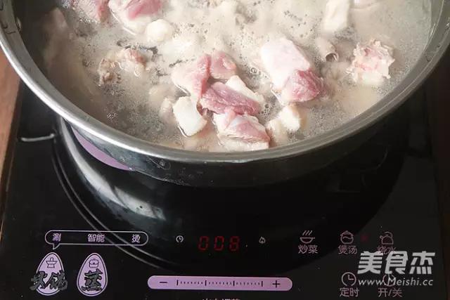 2.鸭肉放进装清水的锅里,按苏泊尔的火锅电磁炉的煲汤键,煮开1分钟飞去血水,水里面放2片姜去去腥,飞水后捞起冲洗干净备用。