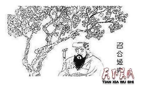 其五、廉政鼻祖。召公不仅勤政爱民,而且清正廉洁。他为官一方,造福一方清廉,以殷纣王的残暴不仁为警戒,免除暴政,轻徭薄赋,所辖区域,政治清明,社会安定,百姓安居乐业,民风淳朴。召公还常常不辞辛苦,下乡巡视察看,在田间地头处理民间事务,了解百姓疾苦,奖励农桑。凡遇民间诉讼,他都仔细察明,秉公决断。那时黄河经常泛滥,气候干旱成灾。召公就在甘棠树下和国人一起寻找救灾大计,共谋抗旱方略。召示青壮奋力自救,攀山越岭,寻找水源,与国人一起早出晚归,同甘共苦。一天来到崤山一带,太阳落山,为了不打扰百姓,他就在甘棠树下,搭一草棚住下。地方官吏要让百姓腾出房屋让他歇息,召公马上制止,曰:“不劳(我)一身,而劳百姓,不是仁政。”这样,召公就在山野的棠树下休息,摘吃棠梨果子解渴充饥,并告诫地方官吏,这甘棠树真好,浓荫郁郁葱葱,果实甜酸可口,百姓劳作累了,可以歇息解渴,要让百姓好好保护它,不要乱砍滥伐。百姓闻听,盛赞召公体恤民情,广施惠政,深得民心,并编成歌谣,广为传诵。