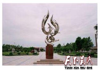 你看,自西到东的广场中心地带,有两个最醒目的亮点。偏西的硬化区域,矗立着一尊银光闪闪的雕塑,底座由印度红色花岗岩砌成,上书四个金光闪烁的大字:鸾凤和鸣。这是毛泽东的女儿李讷的手写体,是她参观周公庙时书写的,在这里又派上了用场。高高的底座上面,挺立着一只不锈钢制成的灵动腾飞的吉祥鸟——凤凰,显示着引颈高歌、一飞冲天的豪情壮志。而偏东的硬化区段,则在原石砌成的台阶状基座上,竖立着一块扁形巨石。正北的石面上,竖写着“凤鸣广场”四个鲜红大字,很是提神醒目;正南的石面中间,横写着著名的《回延安》的作者、原中宣部副部长、文化部部长贺敬之参观周公庙时的题词:“陕西千里大地,长安十代帝京。我伟大民族历史见证在目,我英雄人民光辉形象如生。向四化进军,当临秦坑,阅兵马之战阵;朝高峰登攀,应上岐山,追九天之凤鸣!”其中最后的结句“追九天之凤鸣”,恰与这广场的祥瑞气氛吻合,也正能体现48万西岐儿女发愤图强、昂扬向上精神状态!