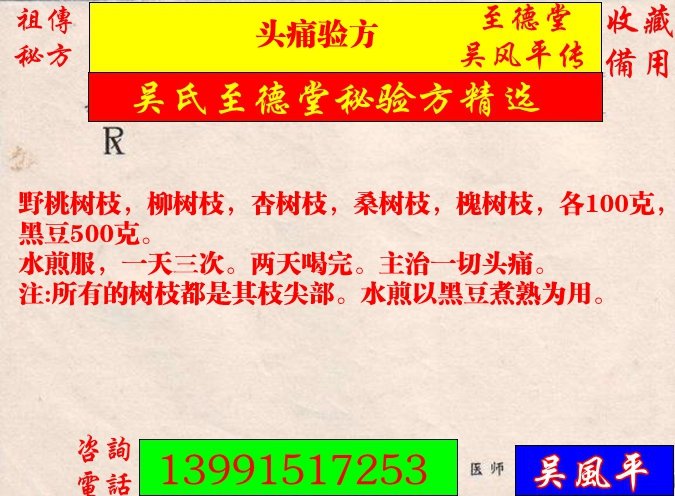 吴风平教授认为健康比什么都重要故而将祖传秘方公开分享给大家其宗旨是让每我们健康快乐生活。是吴家的幸事,更是大家的好事。但中医秘方因人因病因个体而辩证施治,药方因季节、地域差异等特征。所以使用处方前务必电话咨询医师相关事宜以达到更好疗效。
