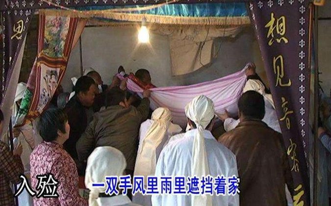 入殓时须娘舅、族老、外甥、孝子贤孙均在场,门窗紧闭,不能有一点响动。殓后,若男,外甥检视衣衾、棺木是否得体;若女,则要娘家人检视以后方可盖棺封口。