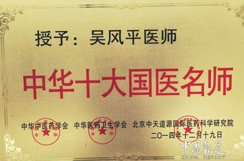 【个人荣誉】国家卫生部授予“中华名医”荣誉称号。联合国国际医科大学、世界自然医学基金会、世界自然医学组织联合授予“人类医药大师”;“世界千年名医”“世界好医师”“杰出贡献奖”。中国企业文化促进会、中国社科院、清华大学、中国国际职业经理人协会联合授予“中国优秀医疗科技工作者”。中国医疗保健国际交流促进会授予“杰出贡献奖”。特邀出席中国名医第四届论坛大会,受到中央领导和国家卫生部领导的表扬和接见;吴风平创办并领导的“安康传统医学研究所”因在科研上取得重大成果,而被评审授予“三星级单位”及“中国优秀职业经理人”称号。中国民营经济研究会、中国最具发展潜力企业高层论坛组织委员会授予“中国最具发展潜力企业”和“中国最具发展潜力企业领军人物”称号。中华中医药学会授予“全国基层优秀中医”光荣称号。吴风平先生的个人事迹被录入《世界名医大典》、《中国中医名人榜》、《中国优秀特色专科名医荟萃》、《中华各界建设先锋人物》《世纪风采人物》等大型权威辞书。