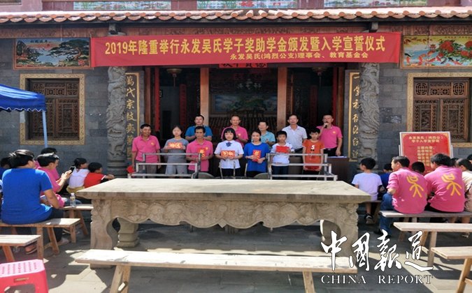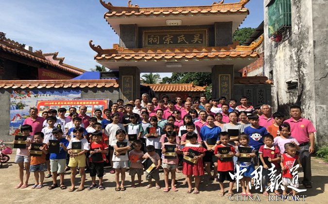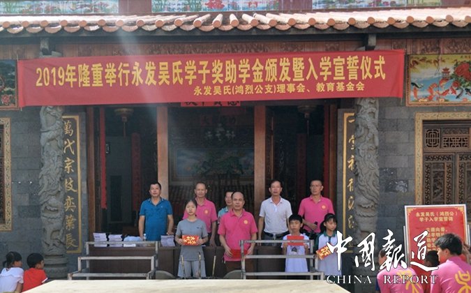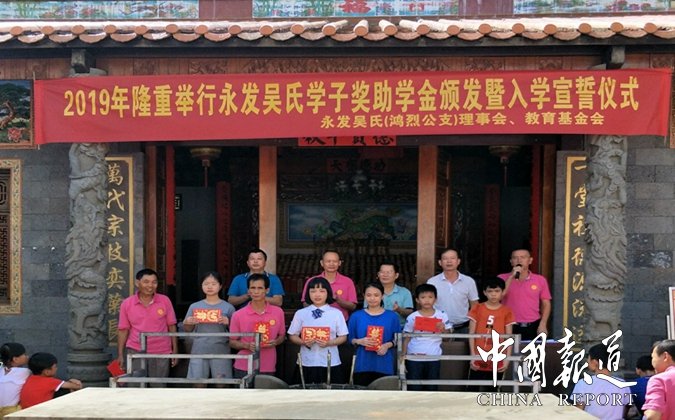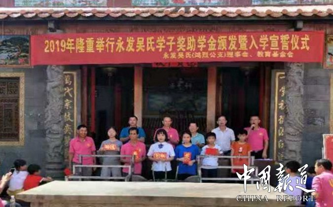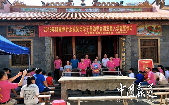 中国报道讯(特约撰稿吴乾山)为弘扬中华传统文化,重教兴邦,促进文明和谐,8月18日,海南省澄迈县永发吴氏(鸿烈公支)理事会,教育基金会,在永发村吴氏宗祠举行吴氏学子,奖助学金颁发暨入学宣誓仪式。来自本支族学子20人得到奖、助学金。其中高考大学录取生4名,初升高,市县重点中学4名,参加全国学科竟赛一、二等奖各1名,小学年级春季期末考试总分前十名2名,资助中小学贫困生10名。