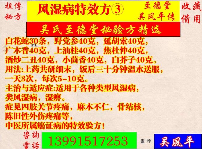 主治与适应症:适用于各种类型风湿病,类风湿病,湿痹。症见四肢关节疼痛,麻木不仁,骨结核,陈旧性外伤疼痛等,中医所属癌证病的特效验方!