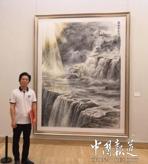 中国画《流芳千古》左上角的黄色光线很引人注目。这是吴辉忠在创作过程中的别出心裁。 “在画中出现光源一般是西画才有的体现,我这幅国画的创新之处就在这里。”吴辉忠告诉记者:“光线从高山与高山的狭缝中投射出来的美景,是对祖国大好河山的美好写照,也是改革开放40年来祖国人民沐浴在党的雨露和阳光中的隐喻。” “你画过的纸叠起有多高,你的程度就有多高。”