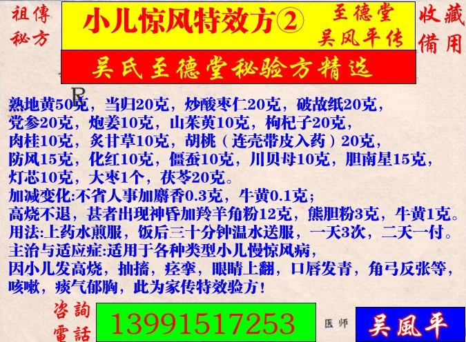 主治与适应症:适用于各种类型小儿慢惊风病,因小儿发高烧,抽搐,痉挛,眼睛上翻,口唇发青,角弓反张,等,咳嗽,痰气郁胸,此为家传特效验方!