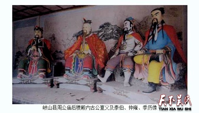 没过几年,公亶父在泰伯三兄弟得力辅佐下,把岐山周塬建设得更加富强。公亶父在岐山建立了周王朝,统领了中原许多部落,世人尊他为周太王。泰伯在岐山的时期里,不但带领兄弟百姓为父亲分忧解难,也潜心系统的学习,思想观、道德观也都是在那个时期形成的,并且熟练掌握了天文、地理、农业农耕文化与耕作技术。