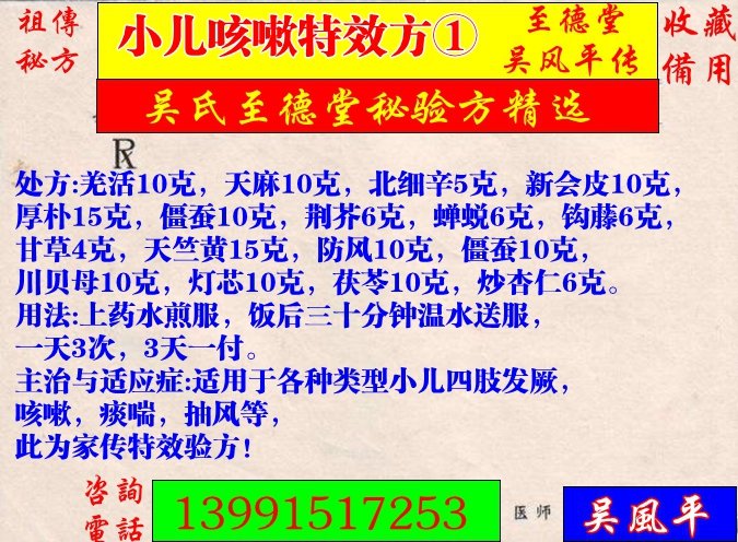 主治与适应症:适用于各种类型小儿四肢发厥,咳嗽,痰喘,抽风等,此为家传特效验方!