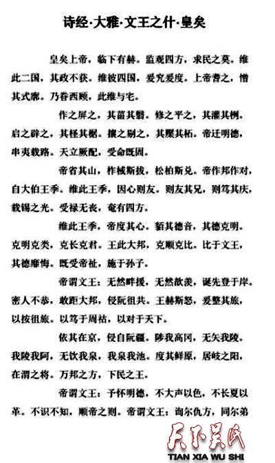 在另一首诗《大雅大明》里,有一段也是歌颂王季的:“挚仲氏任,自彼殷商。来嫁于周,曰嫔于京。乃及王季,维德之行。太任有身,生此文王。”说明白点,即是:挚国任氏二姑娘,来自迢迢那殷商。出嫁进入西周城,做了京都的新娘。他与王季来相配,为善积德两相当。太任不久怀身孕,于是生下周文王。由此可以看出,王季在贤内助太任夫人的配合下,是一直积德行善、施行仁政的。他与太任生养了后世大名鼎鼎的周文王。可以想见,夫妻俩都是教子有方的,致使周邦的事业后继有人,德政大行其道,影响力与日俱增。因此,王季和他的父亲太王及儿子文王一样,都是周王朝的开国元勋。尽管王季在位只有十几年就遭到商王文丁的嫉恨而被杀害了,但他为兴周所做的贡献是永不磨灭的。