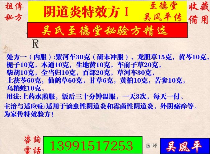 主治与适应症:适用于滴虫性阴道炎和霉菌性阴道炎,外阴瘙痒等。为家传特效验方!