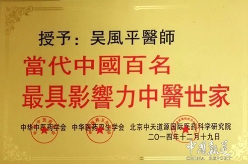 【个人荣誉】国家卫生部授予“中华名医”荣誉称号。联合国国际医科大学、世界自然医学基金会、世界自然医学组织联合授予“人类医药大师”;“世界千年名医”“世界好医师”“杰出贡献奖”。中国企业文化促进会、中国社科院、清华大学、中国国际职业经理人协会联合授予“中国优秀医疗科技工作者”。中国医疗保健国际交流促进会授予“杰出贡献奖”。特邀出席中国名医第四届论坛大会,受到中央领导和国家卫生部领导的表扬和接见;吴风平创办并领导的“安康传统医学研究所”因在科研上取得重大成果,而被评审授予“三星级单位”及“中国优秀职业经理人”称号。中国民营经济研究会、中国最具发展潜力企业高层论坛组织委员会授予“中国最具发展潜力企业”和“中国最具发展潜力企业领军人物”称号。中华中医药学会授予“全国基层优秀中医”光荣称号。吴风平先生的个人事迹被录入《世界名医大典》、《中国中医名人榜》、《中国优秀特色专科名医荟萃》、《中华各界建设先锋人物》《世纪风采人物》等大型权威辞书。