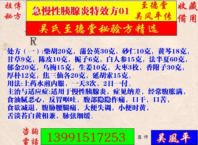 主治与适应症:适用于急性胰腺炎发作期,胰腺癌早期或已经有癌变形成。症见腹部剧烈疼痛,口干口苦,恶心呕吐,反胃膈逆,恶油腻,腹胀,不思食,舌苔黄白相兼,脉浮数细等,为临床常用特效验方!