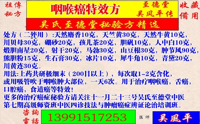 主治与适应症:适用于咽喉癌早中期,症见咽喉肿痛,口干舌燥,咽喉干裂,饮水不能缓解,饮食受阻,声音嘶哑等特效!为千金不传之方。