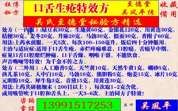 主治与适应症:适用于口舌生疮,赤烂疼痛难忍,口腔癌,舌癌早中期,症见口舌口腔糜烂肿痛,口干舌燥,咽喉干裂,不能饮食,声音嘶哑等特效!为千金不传之方。